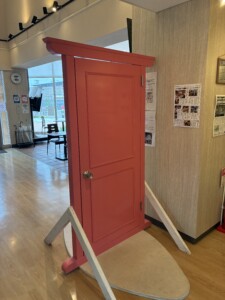 時計とともにもう一つ確認したいことがありました。「希望のとびら」です。駅舎と併設された建物があり、そこでは双葉町の紹介や町民の声などを紹介する展示されていました。3年前、駅舎に併設された建物1階に入ると、すぐ目の前にピンク色のドアが立っていました。掲示された説明書には「双葉駅では、解除の瞬間(午前0時)に希望のとびらを開き、双葉町の新たなスタートを祝いました」とあり、「希望のとびら」と名付けられていました。